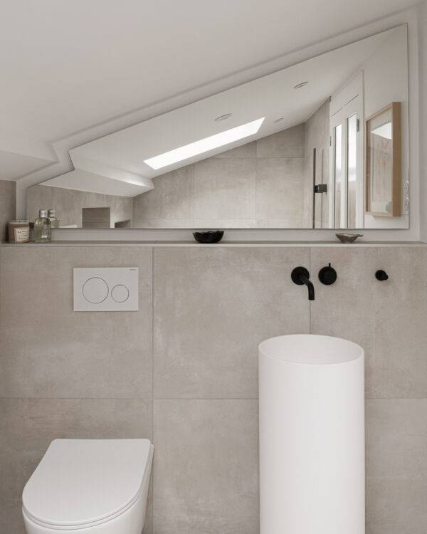 기존 욕실 구조를 완전히 허물고 배관, 전기, 난방까지 모두 재시공했다. 벽을 활용한 매립 선반, 원통형 독립 세면대, 천창 아래 욕조는 ‘창고였다’는 말이 무색한 고급 호텔 느낌을 자아낸다. 침실과 함께 연결되는 구조라 실용성과 동선도 훌륭하다.
