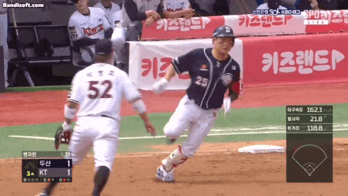 5월 21일 KT 위즈전에서 안타를 치고 2루를 노리다 비명횡사한 양의지(두산 베어스). 자신의 스피드를 과대평가(?)한 탐욕 주루의 결과 2루에서 점프 몸개그 장면만 남기고 아웃!