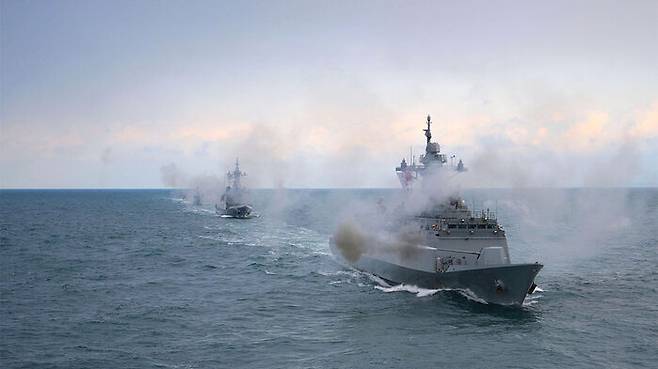 2함대는 호위함 충북함·천안함과 유도탄고속함 조천형함과 해상작전헬기 AW-159 1대가 훈련에 참여했습니다.