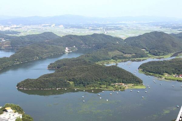 초평호를 굽어보는 한반도지형 전망 공원은 이름처럼, 꼭대기에 오르면 한반도 모양을 그대로 닮은 지형이 한눈에 들어옵니다. 특히 이 공원까지 오르는 꼬불꼬불 드라이브 코스는 오르기만 해도 재미가 있죠. 날씨가 좋은 날에는 멀리까지 시야가 트여 호수 위로 반짝이는 햇살이 그림처럼 펼쳐집니다.