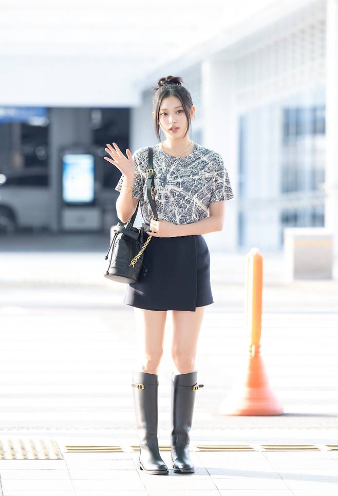 또한, 블랙 컬러의 치마바지와 롱부츠, 백에 유니크한 패턴이 돋보이는 티셔츠의 시크한 스타일링을 완벽 소화했습니다.