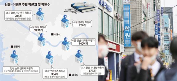 그 외 신흥 학군지로는 최근 형성된 용인 수지구(성복·풍덕천·죽전동) 수지구청역 인근 아파트와 학원이 핵심지로 떠올랐다. 수원 영통구에선 영통역 인근 학원가가 강세다.