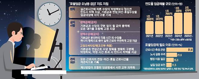 우선 기본급과 수당을 구분하지 않는 '정액급제'나, 연장근로수당·야간근로수당 또는 휴일근로수당을 구분하지 않고 제 수당을 포괄해 산정·지급하는 '정액수당제'를 원칙적으로 금지했다. 특히 현장에서 널리 쓰이는 '고정 OT(초과근무시간) 약정'에 대해선 연장·야간·휴일근로수당을 항목별로 정액 지급하기로 약정했더라도, 실제 근로시간을 기준으로 산정한 법정 수당이 더 크면 그 차액을 지급하도록 명기했다. 기업이 약정 금액만 지급하고 추가 수당을 주지 않는 관행에 제동을 건 셈이다.