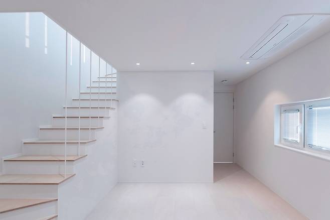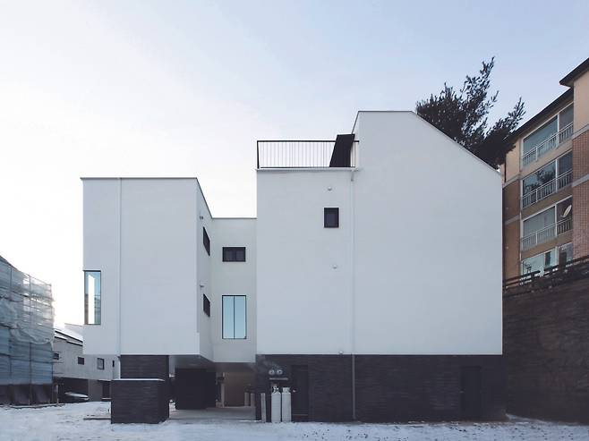 구름집은 기존 구조를 활용하면서 1층과 2~3층의 외부 마감재 색상과 질감이 대비되도록 구분한 집이다. 마치 흰 구름이 둥둥 떠 있는 듯한 모습은 ‘구름집’이란 이름을 따온 배경이다. 1층 필로티는 철근콘크리트조로 된 근린생활시설 공간, 2~3층은 철골조로 된 주거공간으로 계획했다. 용도는 분리돼 있지만 전체적으로는 조화를 이루는 디자인으로 방향을 설정했다.