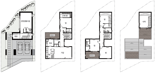 건축주의 집짓기는 시작부터 순탄치 않았다. 악질 시공사는 이곳 주택을 포함해 단지 내 여러 주택을 저가로 시공 계약하고 초반에 기성금을 많이 받은 뒤 고의로 파산해 버렸다. 골조를 세우는 단계에서 공사가 멈췄고, 결국 건축주는 우리를 찾아 왔다. 그렇게 근생주택인 구름집의 프로젝트가 시작됐다.