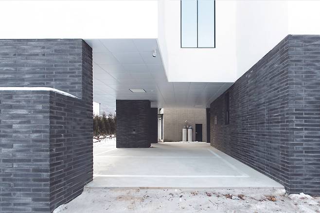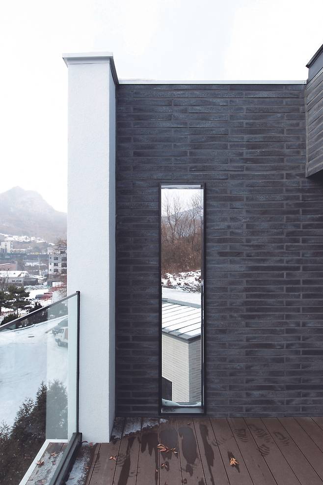 1층 기단부는 블랙 롱브릭타일과 블랙 창호 프레임으로 마감해 언뜻 보기에 한 개 층이 없는 듯 보인다. 차에서 내려 집으로 진입하는 동안에도 비를 맞지 않도록 필로티 밑에 주차공간을 여유 있게 계획했다. 2~3층은 1층과는 대비되는 흰색 스터코로 외장재를 선택했다. 여기에 빗물 자국과 같은 오염에도 깔끔하게 유지할 수 있도록 지붕과 테라스에 물끊기 설계를 적용했다.
