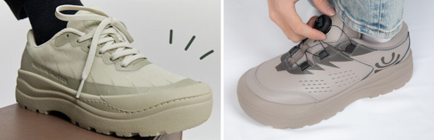 제화 스타트업 나인투식스의 ▲물컹슈즈 오리지널 ▲물컹슈즈 2.0 ▲물컹슈즈 3.0은 발 편한 기능성 운동화입니다. 한국인의 발 관련 데이터 3만여 건을 모아, 표준 한국인의 발 모양을 따라 구조를 설계했습니다. 오리지널과 2.0은 끈으로 묶는 방식이고 3.0은 다이얼 방식입니다. 무난한 디자인으로 어느 옷이든 두루 잘 어울립니다.