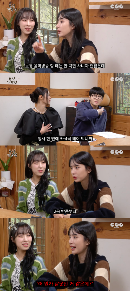 이에 설아는 “특히 언제 많이 느끼냐면, 행사 할 때. 두곡 반쯤부터 이거 뭔가 잘못됐다, 이거 잘못된거 같은데”라고 밝혔고, 이용진은 “행사 한 번에 3~4곡 해야 되니까”라고 공감했다.