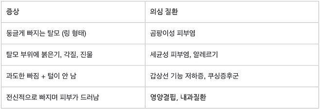 털 빠짐이 단순한 털갈이가 아닌 질환의 신호일 수 있는 경우는 다음과 같습니다.