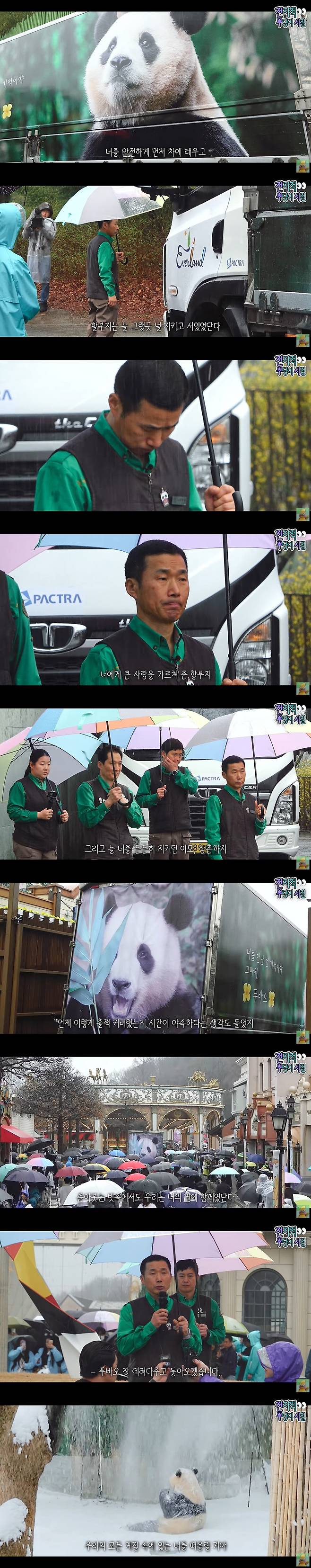 푸바오를 먼저 차에 태우고, 강철원 사육사는 늘 그랬듯 차 앞에 서서 푸바오를 지켰다. 쏟아 붓는 빗 속에서도 많은 시민들이 푸바오의 한국에서의 마지막 모습을 지켜보기 위해 에버랜드를 찾았다.