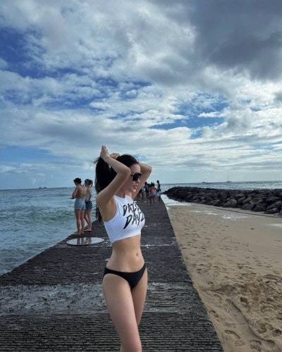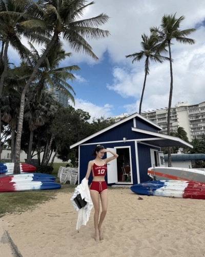 효민은 이번 하와이 신혼여행에서 캐주얼하면서도 스포티한 스타일의 비키니를 선택했어요. 화이트 크롭탑 슬리브리스에 블랙 바텀을 매치해서 그녀의 완벽한 몸매 라인을 더욱 돋보이게 했죠. 😍 편안해 보이면서도 섹시한 느낌까지 놓치지 않은 센스! 그리고 강렬한 레드 색상의 스포티한 탑과 숏츠를 착용해서 톡톡 튀는 매력까지 더했어요. 쨍한 컬러가 효민의 하얀 피부와 너무 잘 어울리는 거 있죠? 💋
