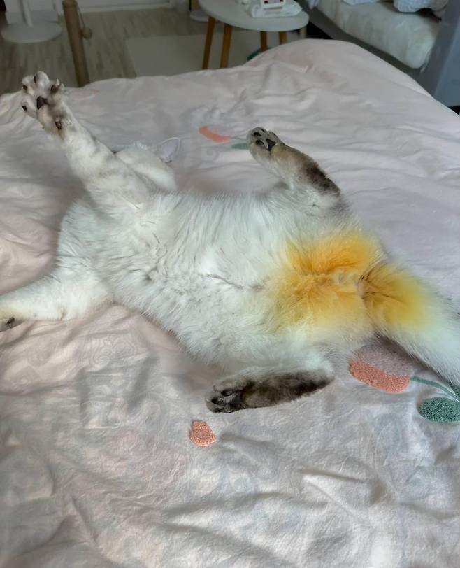 고양이의 엉덩이 부분은 태어날 때부터 원래 노란색이었으며, 어릴 때는 색이 옅었지만 성장하면서 점차 진해져 현재의 모습을 갖추게 되었다고 합니다.