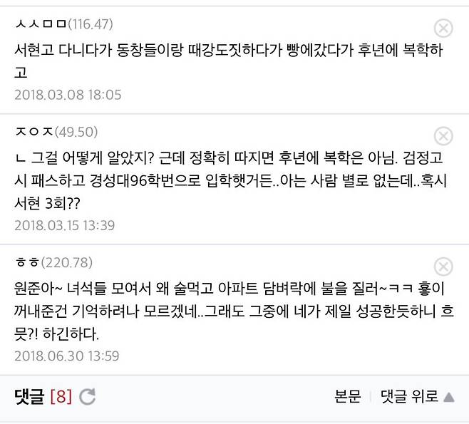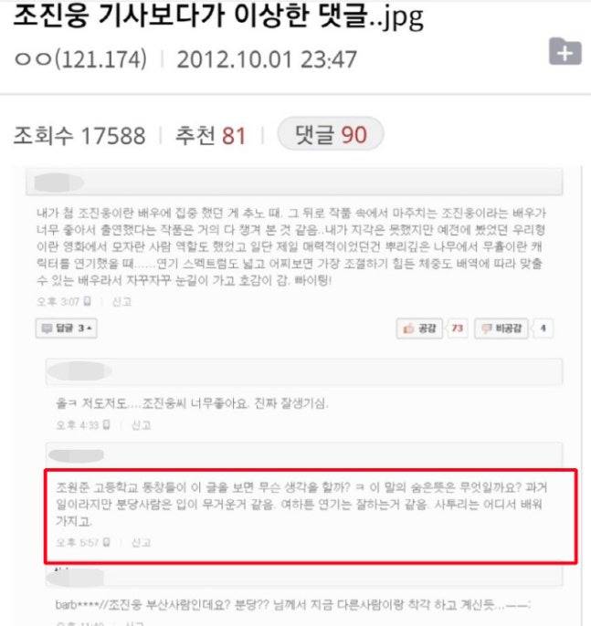 이 과정에서 네티즌들은 이미 2012년과 2018년 온라인 커뮤니티에 올라온 조진웅 관련 글을 찾아내며 의혹 제기에 힘을 실었다. “서현고 다니다가 동창들과 떼강도짓하다 빵에 갔다”, “검정고시 보고 복학 안 했다”, “원준아~ 녀석들 모여서 왜 술 먹고 아파트 담벼락에 불을 질러.. 형이 꺼내준 건 기억하려나 모르겠네.. 그래도 그중에 네가 제일 성공한 듯하니 흐믓하긴 하다” 등 당시 작성된 댓글은 구체적인 정황 묘사로 인해 지금 와서 보면 섬뜩할 정도로 보도 내용과 유사하다. 심지어 “조원준 고등학교 동창들이 이 글을 보면 무슨 생각을 할까”라는 2012년 댓글까지 주목받으며, 조진웅의 과거가 이미 일부에서 암묵적으로 알려져 있었던 것 아니냐는 해석도 나온다.