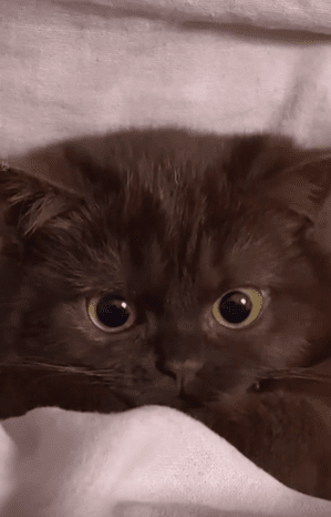 방 안은 살짝 어둑하고, 이불 속은 적당히 따뜻했습니다. 그 포근한 공간 한가운데, 약간 어두운 갈색빛의 고양이가 조용히 누워 있었습니다. 부스스한 털이 이불 위로 자연스럽게 퍼져 있었고, 그 사이로 크고 맑은 눈 두 개가 똘망똘망하게 반짝이고 있었죠.
