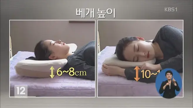 수면 전문가들은 적절한 베개의 높이를 7~9cm 정도라고 말한다. 하지만 사람마다 신장과 무게, 수면습관이 다르니 참고 정도만 해야 하고, 직접 베고 결정해야 한다. 그렇다고 베개를 벨 때마다 X-RAY를 찍을 수 있는 것도 아니니, 코의 높이로 가늠해 보자. 코가 아래로 내려간다면 베개가 높은 거고, 코가 들린다면 베개가 낮은 거다. 이상적인 자세는 코가 제일 높게 위치해 있는 것이다. 내 코가 천장이랑 눈을 잘 맞추고 있는지 확인해 보면서 ‘중도’를 찾는 것이 중요하다.