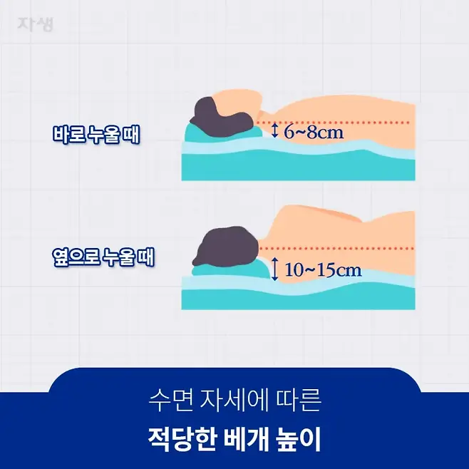 베개를 고를 때 본인이 어떤 자세로 자는 걸 선호하는지도 반드시 고려해야 한다. 이상적인 수면 습관은 척추랑 경추가 같은 선상에 놓이도록 눕는 자세다. 나처럼 옆으로 자는 사람은 높은 베개를 사용하는 게 좋다. 어깨 높이가 있어 목이 더 꺾이기 때문이다. 낮은 베개를 사용한다면 베개에 어떻게든 머리를 대기 위해 어깨는 말리고, 목은 필요 이상으로 꺾여 고개가 옆으로 눕히니 불편할 수밖에 없다.