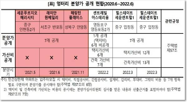 이번에 경실련 자체 분석한 바에 따르면, 민간 상한제 6개 아파트도 공개된 분양가 일부가 제대로 되었다고 보기 어렵다. 주택법에 따라 민간택지에서 상한제 아파트를 분양할 때 분양가는 택지비, 직접공사비 등 7개 항목별로 구분 공개해야 하며, 이중 가산비는 분양가심사위원회 심사를 받은 내용과 산출근거를 포함하여 공시해야 한다(57조 제6항, 7항).