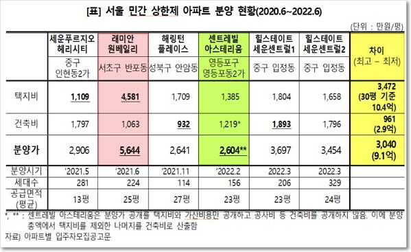 분양가가 가장 높은 아파트는 서초구 래미안원베일리로 평당 5,644만 원이며, 택지비도 4,581만 원으로 단연 최고다. 하지만 건축비는 1,063만 원으로 조사단지 중 성북구 해링턴플레이스 다음으로 낮다. 건축비가 가장 높은 아파트는 평당 1,893만 원의 힐스테이트세운센트럴이다. 세대 수나 세대별 공급면적의 차이가 거의 없음에도 불구하고 수억 원 씩 차이가 발생하지만, 분양가심사위원회는 분양가를 승인했다.