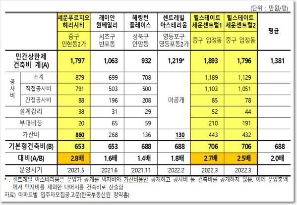 100세대 이상 민간택지 상한제 아파트의 분양가를 조사한 결과, 분양가는 평당 2,604만 원~5,644만 원으로 아파트별 30평 기준 최고 9.1억의 차이가 발생한다. 이중 건축비는 평당 932만 원~1,893만 원이었며, 이를 30평형으로 계산하면 한 채당 건축비는 2.8억 ~ 5.7억으로 나타나 2.9억 원이나 차이났다.