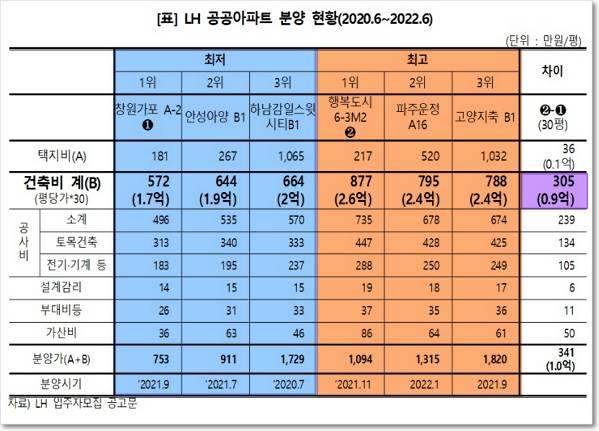 - LH 공공아파트 건축비도 평당 572만 원~877만 원, 30평 기준 9천만 원 차이