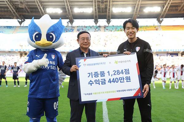 수원은 3일 수원월드컵경기장에서 진행된 기금 전달식에서 지난 4월부터 진행한 행사를 통해 마련한 자립준비청년 지원 기금 440만원을 아름다운가게에 전달하는 뜻 깊은 행사를 가졌다.