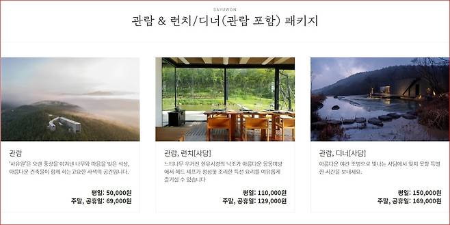 * 식사가능한 패키지에는 관람료가 포함되어 있어서 순한 산책이 아닌 오감으로 즐기는 사유원의 진면목을 경험할 수 있습니다. 홈페이지에 다양한 패키지들을 확인할 수 있습니다.