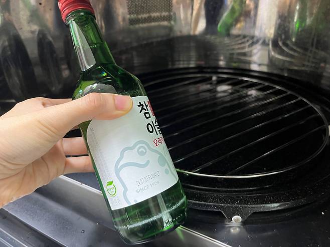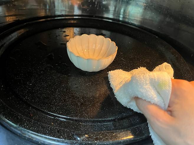전자레인지로 가열된 소주를 마른행주에 살짝 적셔서 내부를 닦아냅니다. 이렇게 하면 조리하면서 여기저기 튄 잔여물도 깨끗하게 닦을 수 있습니다.