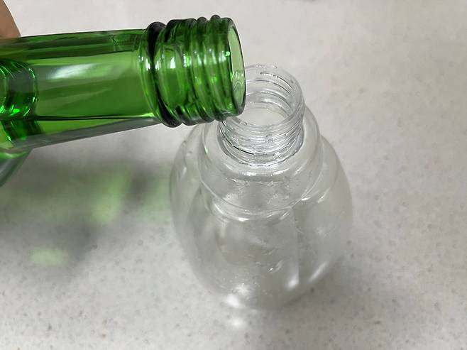 분무기에 소주와 물을 1:1 비율로 넣어서 잘 섞어줍니다.