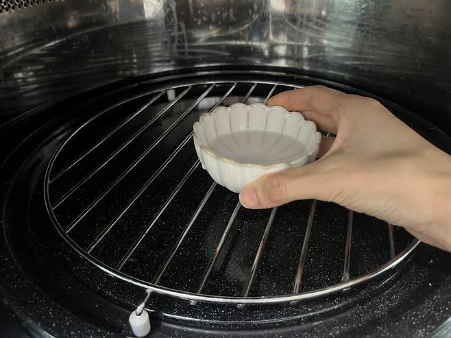 그릇에 담은 소주는 전자레인지 안에 넣고 20~30초 돌려줍니다. 이렇게 하면 소주가 증발하면서 전자레인지의 안 좋은 냄새를 제거합니다.