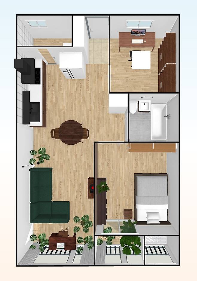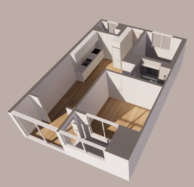 업체 컨택에 앞서 3D 프로그램을 사용해 간단하게 도면을 모델링해 보았습니다. 머릿속으로만 상상하는 것보다 이렇게 직접 눈으로 보고 가구도 배치해보니 훨씬 구체적인 그림을 얻을 수 있었어요. 다양한 가구를 배치해가며 공간도 구성해보고 전체적인 집의 톤 앤 매너도 생각해볼 수 있었답니다.