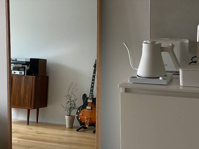 저는 TV를 보지 않고 직업 특성상 집에서 노래를 들으며 책을 읽는 시간이 많아서, 과감하게 거실 중간에 TV 대신 턴테이블을 놓았습니다.