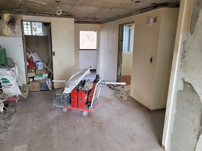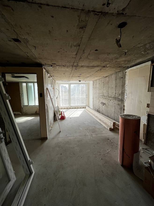 베란다 확장과 바닥 미장을 완료한 상황입니다. 철거만 했을 뿐인데 공간이 확 넓어 보이는 느낌이에요. 여기서 조금 더 공간이 넓어 보일 수 있도록 무엇인가를 하나 더 시도해 보았는데요, 그건 바로...