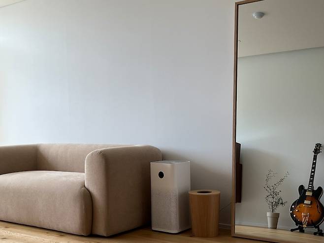 거실 한편에는 원목 대형 거울을 놓았어요. 외출 전에 옷을 단정하기에도 좋고, 거울을 통해 비쳐 보이는 거실의 모습도 마음에 듭니다.
