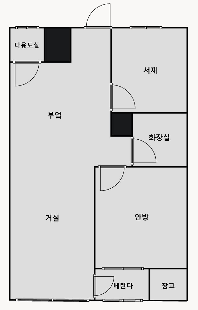 저의 집은 전형적인 투베이 구축 복도식 아파트입니다. 부엌과 거실이 구분되어 있지 않고 일자로 뚫려 있고, 현관문을 열면 집 전체가 보이는 네모 반듯한 구조입니다. 방은 작은방 하나 안방 하나로 총 두 개입니다. 복도 쪽 작은방은 보통 드레스룸이나 창고로 많이 사용하시지만, 저는 예전부터 로망이었던 서재를 만들기로 결심했습니다.