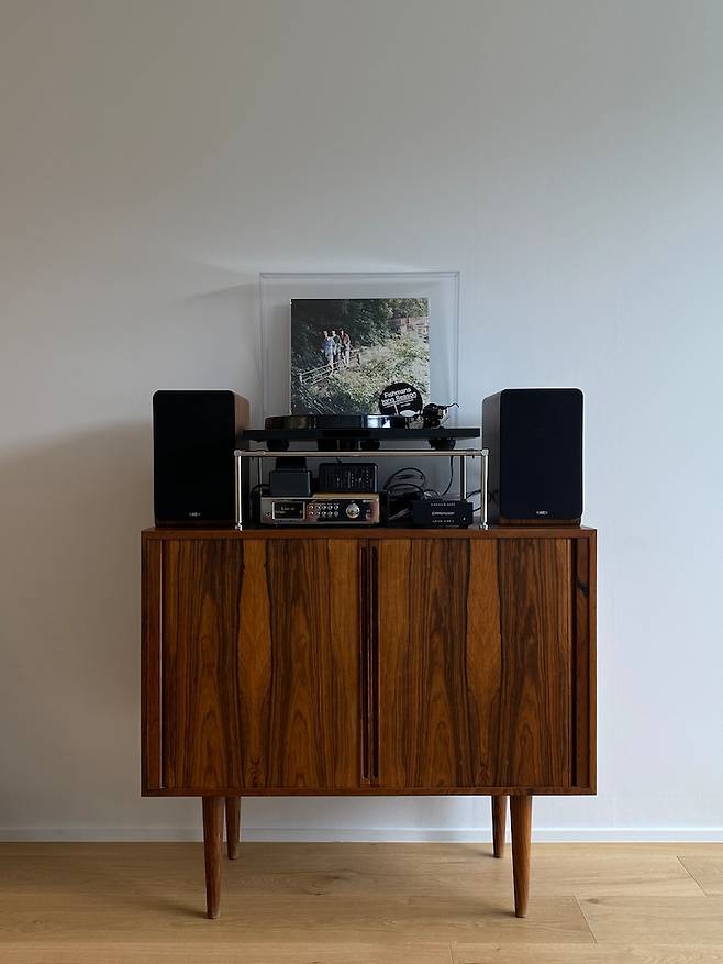 저희 집의 주인공이라고 할 수 있는 로즈우드 사이드보드와 턴테이블입니다. 사이드보드는 덴마크 디자이너 카이 크리스티안센의 1960년대 빈티지입니다. 지금은 벌목이 제한된 로즈우드로 만들어졌는데, 탬버보드의 만듦새도 훌륭하고 무엇보다 나무의 결이 너무 예뻐요. 사이드보드 안에는 가지고 있는 LP와 CD를 보관하고 있습니다.