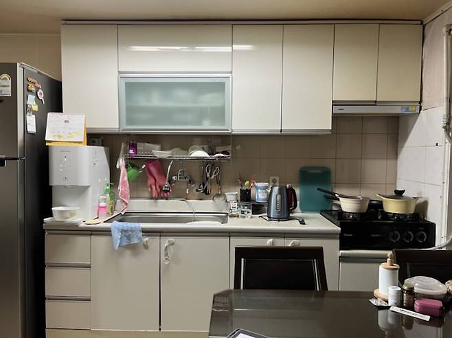 공사 전 주방의 모습입니다. 상부장이 지나치게 아래로 길게 내려와 있고, 선반의 레이아웃이 정돈되어 있지 않아 혼란스러운 느낌을 줍니다. 또 냉장고가 싱크대 왼쪽 편에 위치해 있어 부엌이 더 좁아 보이는 느낌이 듭니다.