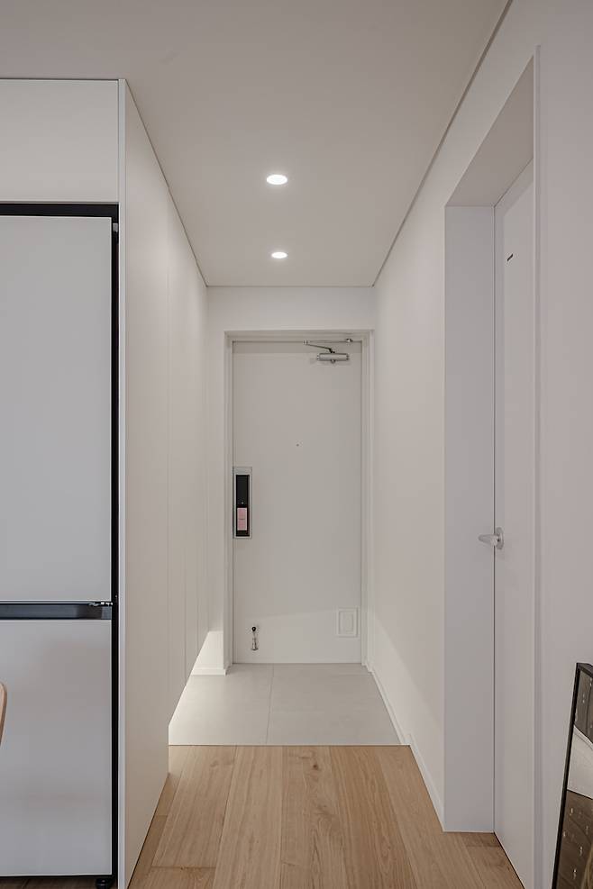 고심 끝에 정면에 보이는 현관 옆 빈자리에 냉장고장을 짜기로 결정했습니다. 일인 가구라 원래 투 도어 냉장고를 넣을 생각이었는데, 사이즈가 딱 맞을 것 같았어요.