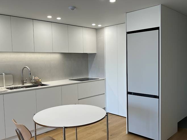 싱크 옆에 있었던 냉장고는 현관 옆에 냉장고장을 짜서 옮기고 그 앞에 원형 식탁을 배치했습니다. 친구들이 많이 오면 거실 쪽으로 식탁을 옮겨서 소파에 앉아서 음식을 먹기도 해요.