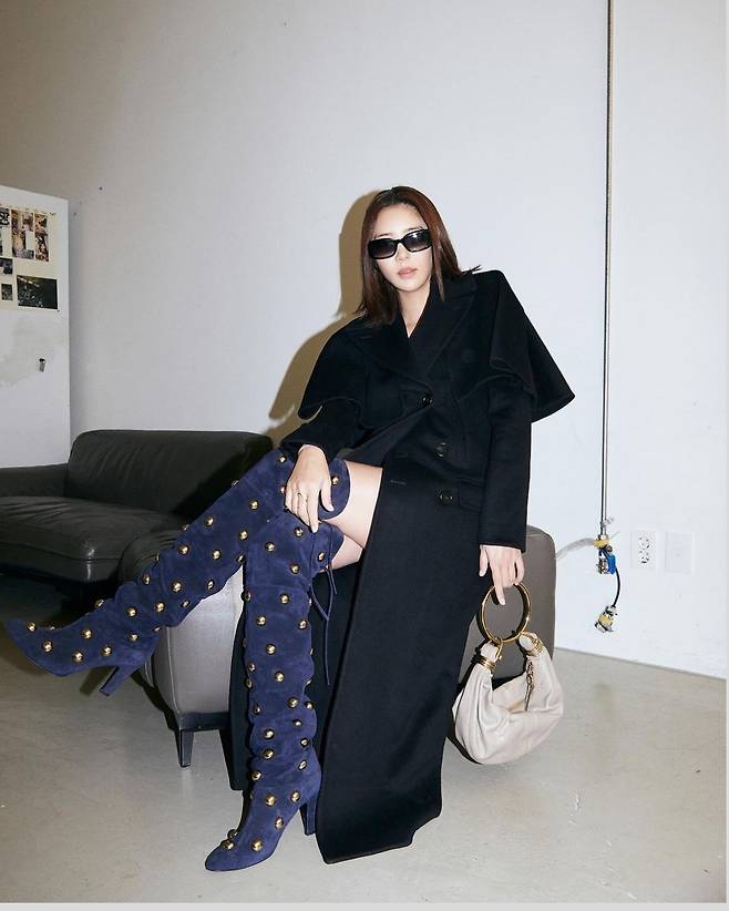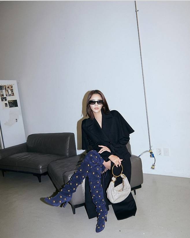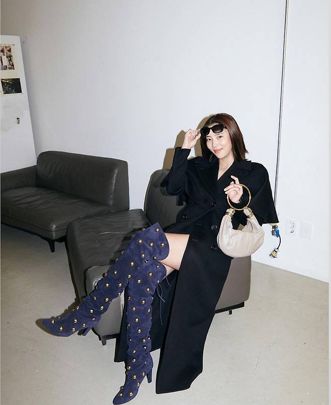 특히 골드 스터드 디테일이 돋보이는 네이비 니하이 부츠는 전체 룩에 강렬한 엣지를 더했으며, 단조로운 블랙 코트와 대조를 이루어 화려한 하이라이트 역할을 했습니다.