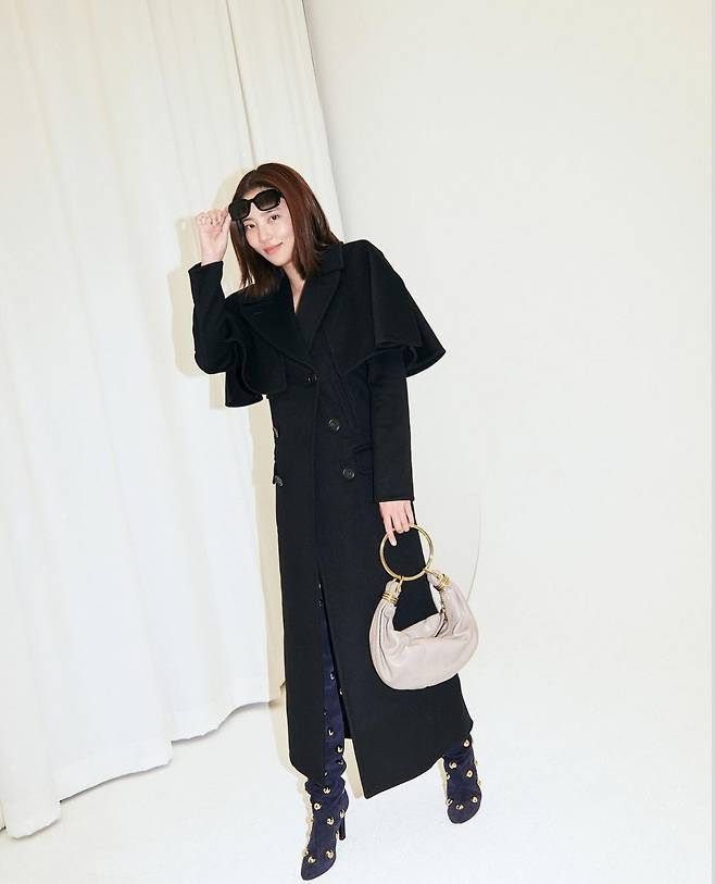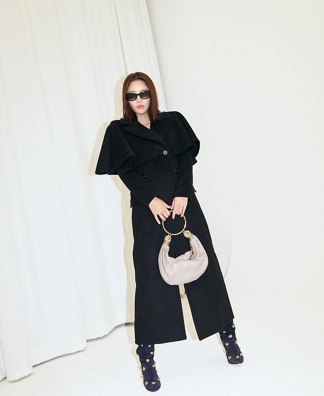 손담비는 구조적인 실루엣과 숄 디테일이 더해진 블랙 롱 코트를 메인 아이템으로 선택해 시크하고 세련된 분위기를 한층 돋보였습니다.