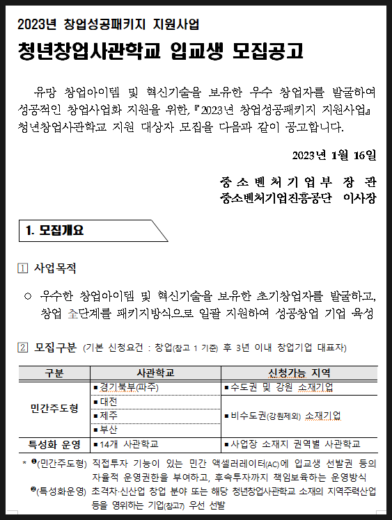 청년창업사관학교는 초기창업패키지와 같은 레벨의 창업사업화 지원사업입니다. 유망 아이템 및 혁신 기술을 보유한 청년 창업자를 발굴하여 창업사업화 등 창업 전 단계를 패키지 방식으로 일괄 지원하기 위해 만들어진 제도죠.