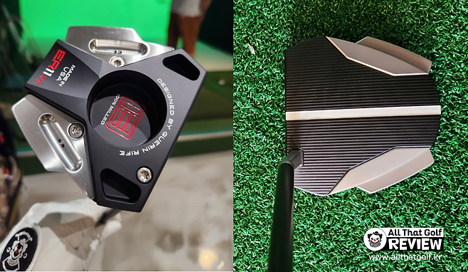 말렛 퍼터이니 사이즈는 작지 않습니다만 그렇다고 엄청 큰 것도 아니네요. 공 뒤에 어드레스 놓으면 테일러메이드 일반 스파이더 모델만 합니다. 이븐롤 ER11V 헤드와 비슷하고, 모델명도 ER11Vx라서 간혹 헷갈릴 분들도 있을듯하네요. 가장 큰 차이는 헤드 뒤쪽 양옆으로 살짝 튀어나온 부분과 얼라인먼트 줄무늬입니다.