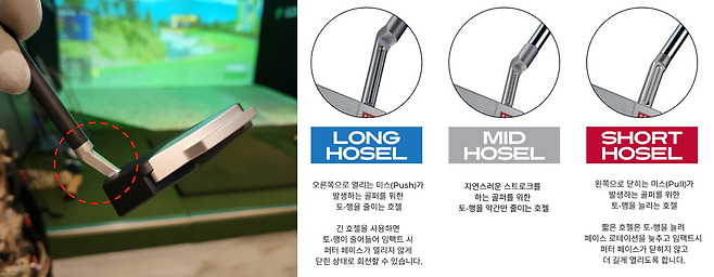 정렬선 외에 이번 ER1VX에서 새롭게 택한 부분은 바로 호젤입니다. 평소 센터 샤프트 퍼터를 매우 선호하고 저에게 잘 맞는 거라고 여겨왔습니다. 하지만, 아래 호젤들의 특징을 본 후, 왼쪽으로 미스 하는 것을 줄이기 위해 거의 처음으로 숏 호젤을 택했습니다. 결과는 숏 퍼팅이 매우 좋아졌고 자신감이 상승했습니다. 조심스레 문지르는 경우도 사라지고 과감히 툭툭 치는 습관이 서서히 자리 잡아가고 있네요.
