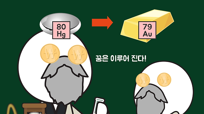 그렇다면 금 원자를 만들 수 있으면 금(Gold)을 만들 수 있다는 것인데, 화학적인 방법으로 가능한지 생각해보면 과거 연금술사들이 수은(Hg)으로 금(Au)을 만들고자 시도한 적이 있습니다.