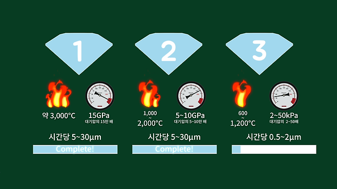 이때 다이아몬드 성장의 온도와 압력은 기존 두 방법에 비해 많이 낮으며 성장속도가 느립니다. 다만, 다른 방법에 비해 결정 구조에 결함은 적어서 주로 연구목적에 사용되고 있습니다.