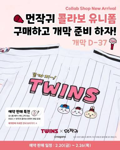 이번 먼작귀 콜라보는 2월 유니폼 예약 판매를 시작으로 본격 진행된다. 팬들이 시즌 개막전부터 먼작귀 콜라보 유니폼을 착용하고 야구장을 찾을 수 있도록 기획했으며, 예약 판매를 통해 유니폼을 구매한 모든 고객에게는 비매품으로 제작된 캐릭터 랜덤 핀뱃지를 증정해 소장 가치를 더할 예정이다.
