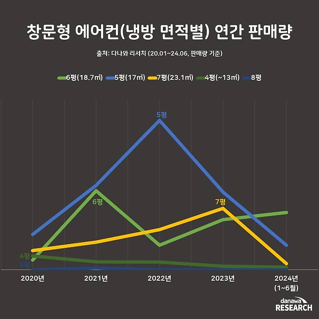 창문형 에어컨은 대부분 10평 이하의 방이나 사무실에 특화된 제품이다. 2020년 초창기 시장은 4~8평까지 다양한 라인업으로 판매했으나, 2021년 5평, 6평 제품의 판매량이 높았고, 2022년 유행의 정점에 오른 시기에 5평 제품이 가장 많이 판매됐다. 2023년에는 7평 제품이 추가되어 5, 6, 7평의 판매량이 비슷해졌다. 판매량은 창문형 에어컨의 제작 기술 발달과도 관련이 있다. 초창기 제품 보다 최근 출시하는 제품들의 효율이 좋아지면서 높은 평수에 속하는 6평, 7평 제품이 각각 인기를 끌었고, 2024년 6월 현재 6평형 제품의 판매량이 상승한 상황이다. 8평형 제품은 6평, 7평 에어컨으로 커버 가능하고, 4평 제품은 너무 작은 냉방 면적을 보여 점유율이 낮은 것으로 추정된다.