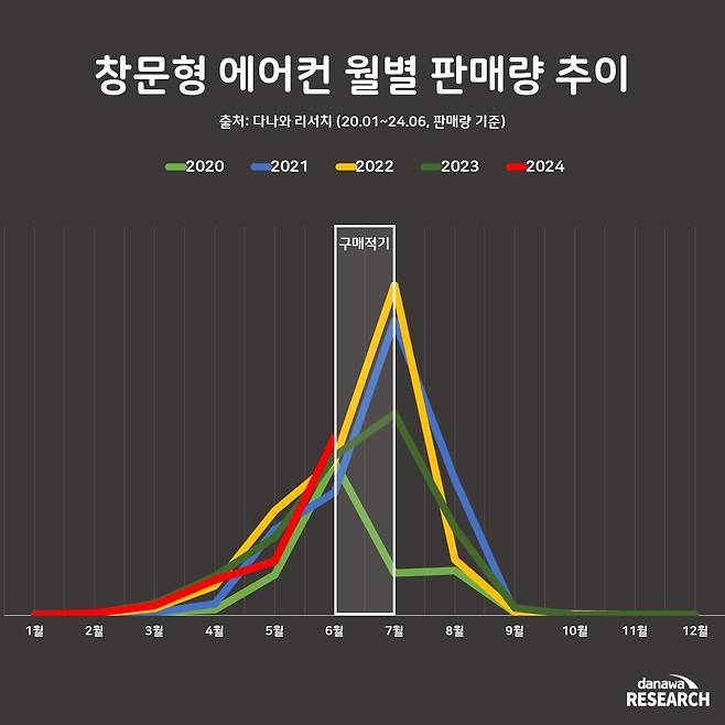 2020년부터 2024년 6월까지의 월별 판매량을 살펴보자. 매년 판매 시작은 4월 말~ 5월 초부터 이루어지고, 6월을 거쳐 7월까지 급상승한다. 7월부터 판매량이 한풀 꺾이더니, 8월까지 판매된 후 9월에 누그러진다. 수치상 구매를 고민한다면 지금이 적기다. 지금 당장 덥지 않다고 여름을 버틸 수 있을 거란 생각은 일단 버리는 게 좋다. 안타깝지만 지구는 시간이 가면 갈수록 여름에 더 더워지고 겨울에는 더 추워지기 때문이다. 완전한 무더위 정점인 7월 중순에는 창문형 에어컨의 수요가 높아져, 원하는 제품이 품절될 수 있으며, 부르는 게 값이 되는 경우도 있으니 주의하자.
