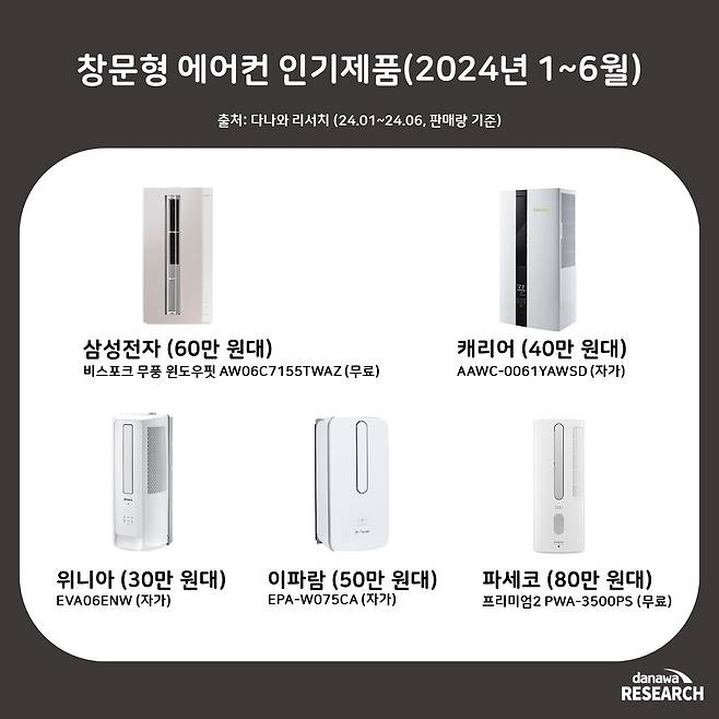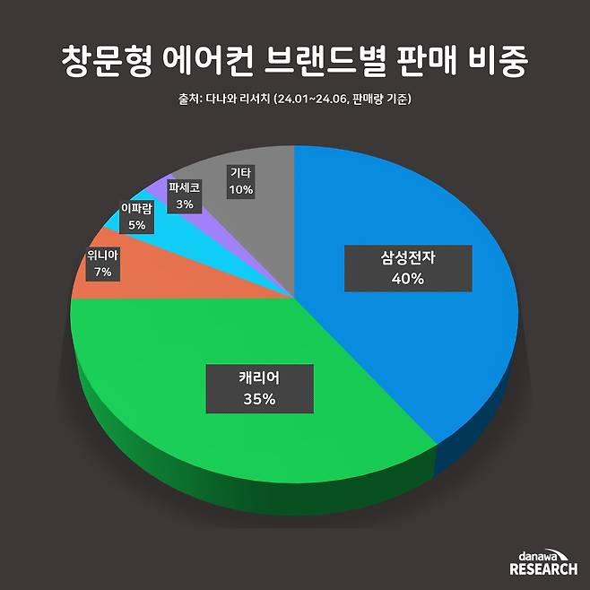 창문형 에어컨은 앞서 설명한 대로 방 하나 정도를 커버할 수 있는 소형 에어컨이다. 이런 특징 때문에 평균 20%대 점유율을 꾸준히 유지 중이다. 창문형 에어컨이라는 개념이 생긴 지난 2020년은 10%의 점유율을 갖고 있었지만, 2021년 19%의 점유율로 2배 가깝게 성장했다. 이후 2022년 20%, 2023년 23%로 점점 점유율을 높여가고 있다. 2024년은 1~6월까지의 점유율로 20%를 유지 중이다. 창문형 에어컨이 가장 많이 판매되는 7월 데이터까지 합산한다면 판매 비중은 20% 이상으로 작년보다 높아질 것으로 전망된다.