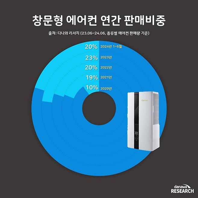 창문형 에어컨은 앞서 설명한 대로 방 하나 정도를 커버할 수 있는 소형 에어컨이다. 이런 특징 때문에 평균 20%대 점유율을 꾸준히 유지 중이다. 창문형 에어컨이라는 개념이 생긴 지난 2020년은 10%의 점유율을 갖고 있었지만, 2021년 19%의 점유율로 2배 가깝게 성장했다. 이후 2022년 20%, 2023년 23%로 점점 점유율을 높여가고 있다. 2024년은 1~6월까지의 점유율로 20%를 유지 중이다. 창문형 에어컨이 가장 많이 판매되는 7월 데이터까지 합산한다면 판매 비중은 20% 이상으로 작년보다 높아질 것으로 전망된다.